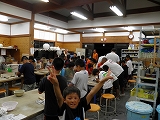 | 夜は陶芸教室です。 晩御飯の前からすごい夕立ちで、敷地内の陶芸教室までバスで行きました。 |