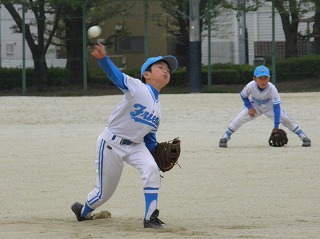| ライトゴロをとるユウ。ゲンキがちょっと邪魔(失礼!)ですが、ちゃんと指示してることがよく分かる。 |