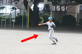 | サードに替わったカズキ。一度一塁を向きますが(ライトマナトも一塁カバーに走ってる)、 |